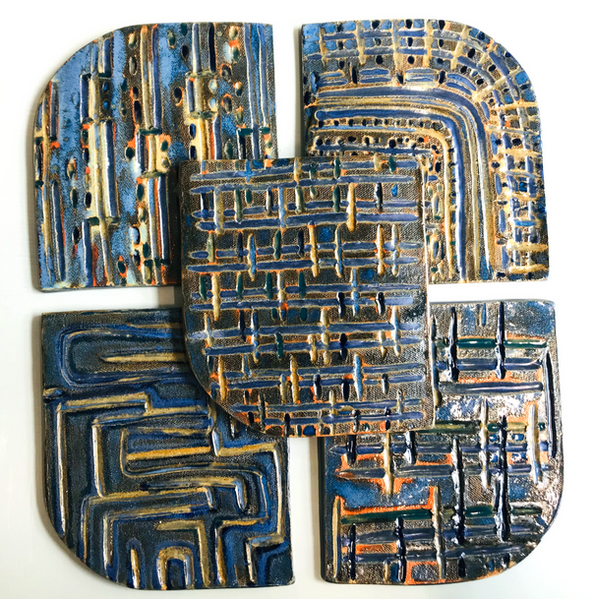 I have always been interested in depicting landscapes with Chinese traditional elements and styles. In my previous landscape paintings and moving image works, I inverted black and white colour from traditional ink landscape painting and developed them into moving images. My current ceramic work is also about landscape but uses Chinese ancient characters – Oracle script font. It is the origin of Chinese writing. I wish to introduce this ancient font to young children of different backgrounds, to help them understand Chinese culture better. From these Chinese Oracle script fonts, which are literally a smart quick sketch of the subject, people can guess the meaning of the character directly from the shape of it. So, I use some characters: ‘mountain, valley, water’ to create ‘Textual Landscapes’. The shape of my ceramic series is also inspired from the shape of the changing landscape. These ceramics imagine mountains, valleys, waters, steppes, and deserts. They all connect to each other to form a continuous fluctuating and curving landscape shape.
